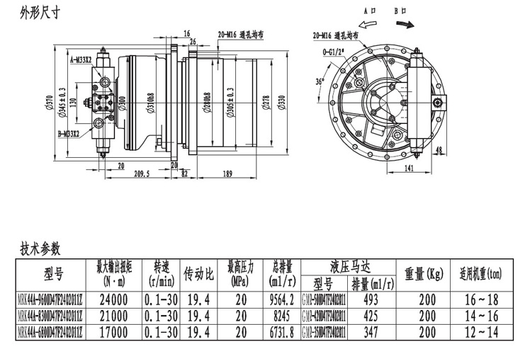 MRK34系列履帶(車輪)用的行走減速機(jī)輸出扭矩在20000NM左右,最低轉(zhuǎn)速能達(dá)到0.2轉(zhuǎn)每分,采用兩級(jí)速比行星齒輪箱傳動(dòng),外形緊湊,機(jī)械通過性極強(qiáng)。