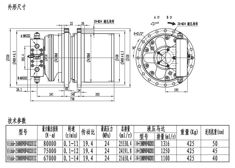 MRK45系列以上的行走減速機(jī)輸出扭矩在40000扭米以上,最大到十萬(wàn)扭米,可采用柱塞馬達(dá)或者斜軸馬達(dá)驅(qū)動(dòng)。一般用在大型履帶底盤或者輪式行走用。